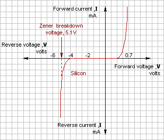 Zener Diodes<^< Worksheet: Diode Characteristics | Course Index | Examples: Zener Diodes >^>(:nl:) ![]() '''Graph showing Zener diode characteristics''' Zener diodes are heavily doped silicon diodes which, unlike normal diodes, exhibit an abrupt reverse breakdown at relatively low voltages (typically less than 6V). A similar effect occurs in less heavily doped diodes. These avalanche diodes also exhibit a rapid breakdown with negligible current flowing below the avalanche voltage and a relatively large current flowing once the avalanche voltage has been reached. For avalanche diodes, this breakdown voltage usually occurs at voltages above 6V. In practice, however, both types of diode are referred to as zener diodes. A typical characteristic for a 5.1V zener diode is shown. Whereas reverse breakdown is a highly undesirable effect in circuits that use conventional diodes, it can be extremely useful in the case of zener diodes where the breakdown voltage is precisely known. When a diode is undergoing reverse breakdown, and provided its maximum ratings are not exceeded, the voltage appearing across it will remain substantially constant (equal to the nominal breakdown voltage or zener voltage) regardless of the current flowing. This property makes the zener diode ideal for use as a voltage reference or voltage regulator. (:nl:)(:table style="clear:both":)