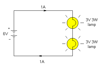 (:Summary:Contains the 'action' links (like Browse, Edit, History, etc.), placed at the top of the page, see site page actions:) (:comment This page can be somewhat complex to figure out the first time you see it. Its contents are documented at PmWiki.SitePageActions if you need help. :) * Print (:comment (:if group Site,SiteAdmin,Cookbook,Profiles,PmWiki*:) (:comment delete if and ifend to enable backlinks:) * %item rel=nofollow class=backlinks accesskey='$[ak_backlinks]'% [[{*$Name}?action=search&q=link={*$FullName} | $[Backlinks] ]] (:ifend:) :) * Login Lamps in Series<^< Basic Lamp Circuit | Course Index | Lamps in Parallel >^>(:nl:) ![]() In the series connected circuit, two 3V 3W lamps are connected in series in order to consume a total power of 6W from the 6V supply. Once again, the current flowing in each lamp can be calculated from: I = P/V = 3W/3V = 1A Note that the same current (i.e. 1A) flows in each lamp. Applying Ohm's Law to determine the working resistance of each lamp (i.e. the resistance when illuminated) gives: R = V/I = 3V/1A = 3Ω The effective resistance of the circuit must be 6Ω (i.e. 3Ω + 3Ω). (:nl:)(:table style="clear:both":)