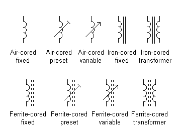 Symbols for inductors can be used to indicate the type of core when it is something other than air. Dotted lines indicate a ferrite core whilst solid lines indicate an iron (or steel) core.