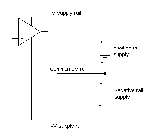 Operational amplifier circuits often use two separate supplies; a positive supply and an equal, but opposite, negative supply. The common connection to these two supplies acts as the common 0V rail and the input and output voltages are usually measured relative to this rail.