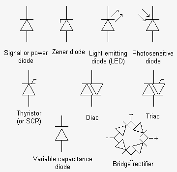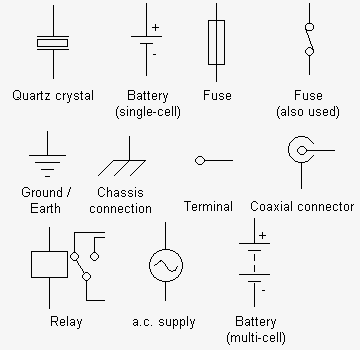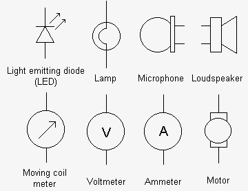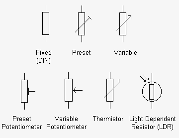(:Summary:Contains the 'action' links (like Browse, Edit, History, etc.), placed at the top of the page, see site page actions:) (:comment This page can be somewhat complex to figure out the first time you see it. Its contents are documented at PmWiki.SitePageActions if you need help. :) * Print (:comment (:if group Site,SiteAdmin,Cookbook,Profiles,PmWiki*:) (:comment delete if and ifend to enable backlinks:) * %item rel=nofollow class=backlinks accesskey='$[ak_backlinks]'% [[{*$Name}?action=search&q=link={*$FullName} | $[Backlinks] ]] (:ifend:) :) * Login Symbols<^< Miscellaneous | Course Index | Circuits >^>(:nl:) >>frame round<< A variety of symbols are used to denote different types of resistor. It is worth noting the difference between preset and variable components and also that potentiometers have three, rather than two connections. >>frame round<< Conventional, non-electrolytic capacitors can be connected into a circuit either way round. Electrolytic capacitors, on the other hand, require a d.c. polarizing voltage and must be connected with the correct polarity. >>frame round<< Symbols for inductors can be used to indicate the type of core when it is something other than air. Dotted lines indicate a ferrite core whilst solid lines indicate an iron (or steel) core. >>frame round<< Thyristors and triacs have a third terminal (the 'gate' or 'trigger') in addition to anode and cathode or 'main terminal 1' and 'main terminal 2', respectively. The bridge rectifier comprises a network of four diodes (note that the junction of the two cathodes forms the positive d.c. output terminal whilst the junction of the two anodes forms the negative d.c. output terminal). >>frame round<< A large number of symbols are used to denote a variety of different transistor types. The two most common symbols are those that are associated with bipolar devices - note that the arrow points outwards at the emitter of an NPN transistor and inwards at the emitter of a PNP transistor. >>frame round<< Many integrated circuits have specialized functions and no particular symbol is associated with them. Logic gates and operational amplifiers, on the other hand, do have recognizable symbols. Note that the '+' and '-' signs on the operational amplifier are used to indicate the 'non-inverting' and 'inverting' inputs respectively - not the power supply connections! >>frame round<< The symbols shown here include the most common types of single-pole, double-pole, and multi-pole switch. Note that a mechanical linkage is sometimes indicated by means of a dotted line linking the contacts operated by a common switch mechanism. >>frame round<< Only a small selection of symbols for indicators and transducers is shown here - a number of common types of transducer (such as the photodiode and the light dependent resistor) appear within the other main categories of component. >>frame round<< This collection of miscellaneous symbols includes the symbols used to depict single and multi-cell batteries as well as those used for common or ground connections.