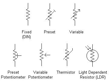 A variety of symbols are used to denote different types of resistor. It is worth noting the difference between preset and variable components and also that potentiometers have three, rather than two connections.