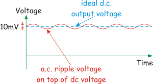 (:Summary:Contains the 'action' links (like Browse, Edit, History, etc.), placed at the top of the page, see site page actions:) (:comment This page can be somewhat complex to figure out the first time you see it. Its contents are documented at PmWiki.SitePageActions if you need help. :) * Print (:comment (:if group Site,SiteAdmin,Cookbook,Profiles,PmWiki*:) (:comment delete if and ifend to enable backlinks:) * %item rel=nofollow class=backlinks accesskey='$[ak_backlinks]'% [[{*$Name}?action=search&q=link={*$FullName} | $[Backlinks] ]] (:ifend:) :) * Login Mains Power Supply Units<^< Rechargeable Batteries | Course Index | Adding Inputs >^>(:nl:) These come in all shapes, sizes and prices, from the battery eliminator, formed around a 13A mains plug, selling at a few pounds, to the sophisticated bench power supply unit, costing several hundred pounds. Power supply jargon:Mains power supply units convert the a.c. (alternating current) high voltage mains electricity supply into a low voltage d.c. (direct current) supply. The following diagrams show the difference between these. ![]() These signals are not drawn to scale. The mains electricity supply in the UK peaks at around 340 volts, whereas we are looking at d.c. power supplies delivering around 6 volts. When choosing a mains power supply unit, you need to consider: * the d.c. output voltage you require * the maximum current the power supply will have to deliver In addition, there are other factors: Problem 1:The d.c. output voltage may still contain a small a.c. fluctuation, known as a 'ripple voltage'. This is removed by a process called 'smoothing'. The factor 'ripple rejection' in the power supply specification measures the effectiveness of the smoothing. Problem 2:The mains electricity supply voltage fluctuates in the course of the day, depending on, what time of day it is, what the weather is like, and what is on the television. Simple d.c. power supplies pass this variation on in the output voltage. If the mains voltage fluctuates by 10%, then the d.c output voltage varies by 10%. A good power supply offers 'line regulation' - making the output voltage independent of variations in the a.c. mains supply voltage. Problem 3:We observed earlier that the voltage provided by a battery usually drops when it is supplying a high current. A similar tendency is seen in mains power supply units. Additional circuitry in the power supply can reduce this. This process is called 'load regulation', or sometimes 'stabilisation'. Typical performance:A typical mains power supply unit has the following performance figures: Ripple voltage - 10mV Line regulation - 0.1% Load regulation - 0.1% Ripple voltage - 10mV This means that on top of the steady dc output voltage, there could be a tiny ac voltage, 10mV high. ![]() Line regulation - 0.1% The output voltage changes by 0.01V when the ac input voltage changes by 10V. Load regulation - 0.1% In switching from maximum output current to no output current, the output voltage changes by only 0.1% (:nl:)(:table style="clear:both":)