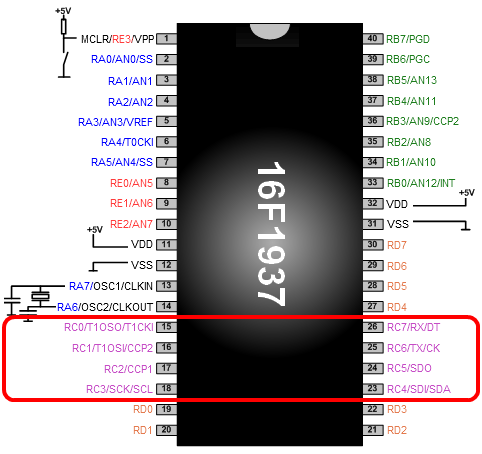 (:Summary:Contains the 'action' links (like Browse, Edit, History, etc.), placed at the top of the page, see site page actions:) (:comment This page can be somewhat complex to figure out the first time you see it. Its contents are documented at PmWiki.SitePageActions if you need help. :) * Print (:comment (:if group Site,SiteAdmin,Cookbook,Profiles,PmWiki*:) (:comment delete if and ifend to enable backlinks:) * %item rel=nofollow class=backlinks accesskey='$[ak_backlinks]'% [[{*$Name}?action=search&q=link={*$FullName} | $[Backlinks] ]] (:ifend:) :) * Login PORT C<^< PORT B | Course Index | PORT D >^>(:nl:) * Full 8 pins of Port C can be used on a 16F1937 device * RC0-RC7 can be used as digital inputs * RC0-RC7 can be used as digital outputs * PWM (Pulse Width Modulation) is possible on RC1 and RC2 * Port C also contains a USART (Universal Synchronous - Asynchronous Receiver Transmitter) and a MSSP (Master Synchronous Serial Port) for serial communication ![]() * The pins of Port C are mapped on the 16F1937 microcontroller as on this drawing ![]() * The pins of Port C are connected to the 9-pin D-type connector of Port C on the Multiprogrammer board. This port is connected to the rest of the PICmicro internals by an 8-bit bus system. (:nl:)(:table style="clear:both":)