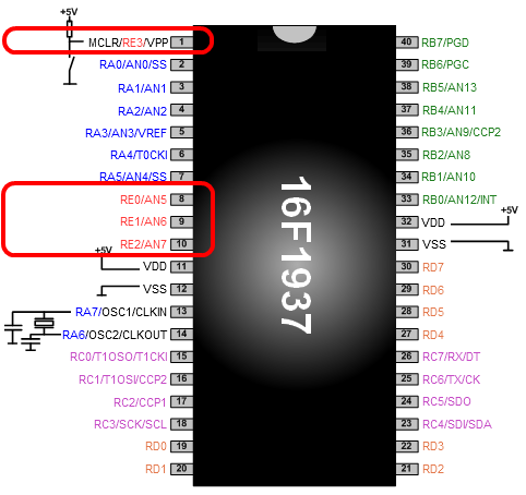 (:Summary:Contains the 'action' links (like Browse, Edit, History, etc.), placed at the top of the page, see site page actions:) (:comment This page can be somewhat complex to figure out the first time you see it. Its contents are documented at PmWiki.SitePageActions if you need help. :) * Print (:comment (:if group Site,SiteAdmin,Cookbook,Profiles,PmWiki*:) (:comment delete if and ifend to enable backlinks:) * %item rel=nofollow class=backlinks accesskey='$[ak_backlinks]'% [[{*$Name}?action=search&q=link={*$FullName} | $[Backlinks] ]] (:ifend:) :) * Login PORT E<^< PORT D | Course Index | Memory in the 16F1937 >^>(:nl:) * Only 4 pins of Port E can be used on a 16F1937 device * RE0-RE3 can be used as digital inputs * RE0-RE2 can be used as digital outputs (RE3 can be an input only) * RE3 is often used as the MCLR pin (i.e. reset) and may not be available to use as an input * AN5-AN7 can be used as analogue inputs (= 3 analogue inputs on port E) ![]() * The pins of Port E are mapped on the 16F1937 microcontroller as on this drawing ![]() * The pins of Port E are connected to the 9-pin D-type connector of Port E on the multiprogrammer board. This port is connected to the rest of the PICmicro internals by an 8-bit bus system. (:nl:)(:table style="clear:both":)