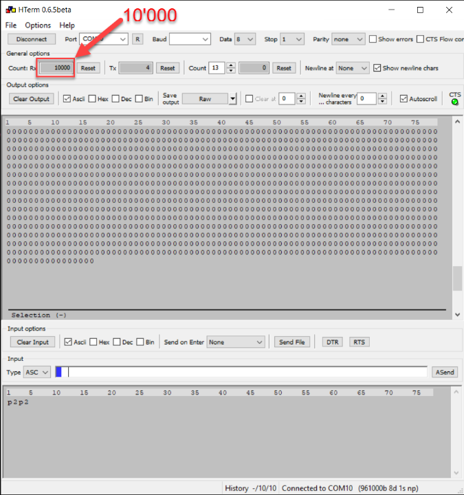 I'd normally handle EOL (CR/LF) in the interrupt too and just signal a new command if EOL received - here however, I test if the received string has a length of >=2 (so p1 p2 etc work - but if you type p1<enter> in the delay time of the main loop then it'll not be recognized (compare str will get 'p1/r/n'..