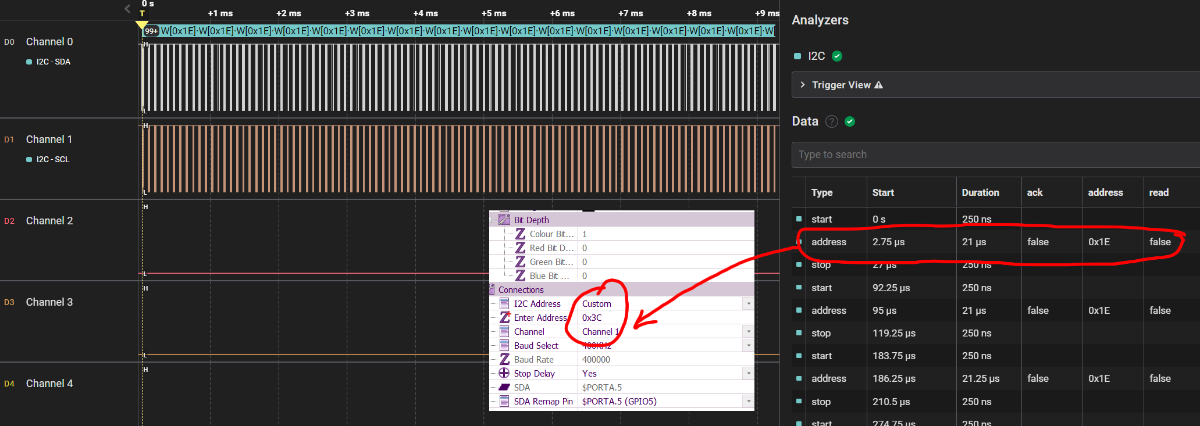 But when I look at the I2C signal on my logic analyser it sends 0x00