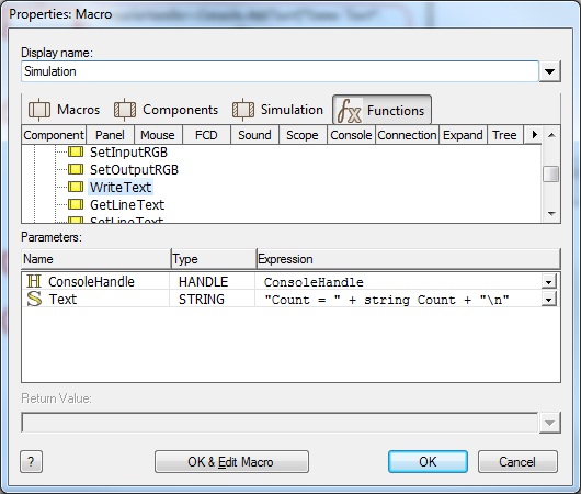 Next we need to assign the handle variable with a value by calling the Simulation API. To do this we add a simulation macro icon to the Main flowchart and double click the item on the flowchart to edit the icon's properties. Inside the icon property window we first need to ensure that the Functions tab is selected and then scroll down to the Console section before clicking the + icon to see all the API calls related to the Console functionality.