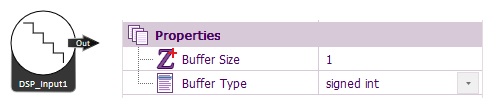 DSP components with an arrow facing away from the component represent a memory block or buffer that can be accessed by one or more other DSP components. The number of values that can be stored and the type of values that can be stored are available via the component properties.